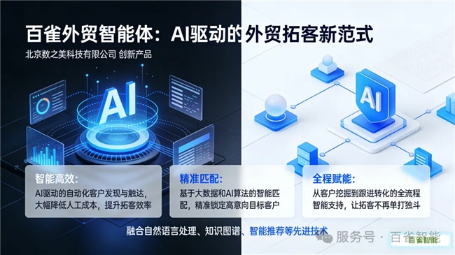 百雀外贸智能体是北京数之美科技有限公司历时多年精心打磨的创新产品,致力于通过前沿AI技术帮助外贸企业实现客户获取的智能化和自动化。
