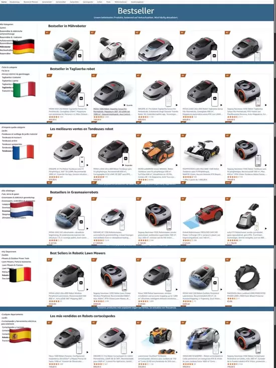 MOVA 割草机器人的全球影响力正加速释放,销量与口碑实现双丰收。近期,其核心产品ViAX系列智能割草机器人,凭借全球首创的AI双目视觉技术,在欧洲市场掀起智能庭院革命,一举斩获亚马逊德国、意大利、比利时、荷兰、西班牙等多国BestSellers榜首。其中,意大利亚马逊平台销量同比增长超1290%,德国亚马逊平台销量同比增长更是突破2360%,展现出惊人的市场爆发力。在多国BAUHAUS渠道,MOVA割草机器人同样表现亮眼,持续稳坐销量第一宝座,成为消费者心中智能割草产品的首选品牌。