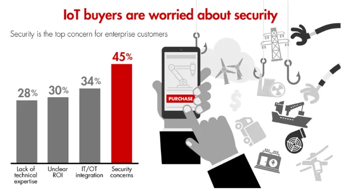 注:45%企业用户担忧网络安全性,而随后担忧问题分别为IT/OT一体化(34%)、不明朗投资回报率(30%)以及专业技术缺失(28%)。