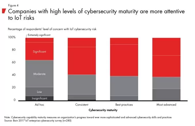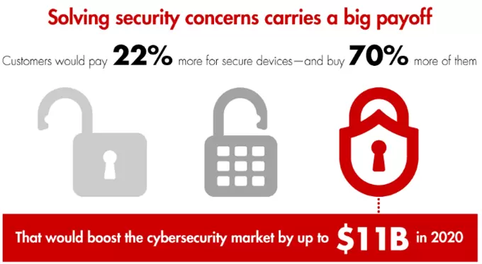 事实上,贝恩咨询公司的研究发现,如果企业客户对网络安全风险的担忧问题得到解决,他们将愿意购买更多的物联网设备,且至少平均比他们担忧这些问题未解决时购买的设备多70%(参见下图)。此外,调查的93%高管表示他们会为安全性更高的设备平均多支付22%的费用。综合而言,贝恩估计提高这些设备安全性可以使物联网网络安全市场增长90亿美元至110亿美元。导致这种市场需求的原因之一可能是《欧盟通用数据保护法规》(GDPR)等新法规带来的压力越来越大,这些法规对安全性不足(包括数据泄露)的公司提出了严格的数据保护要求和惩罚。