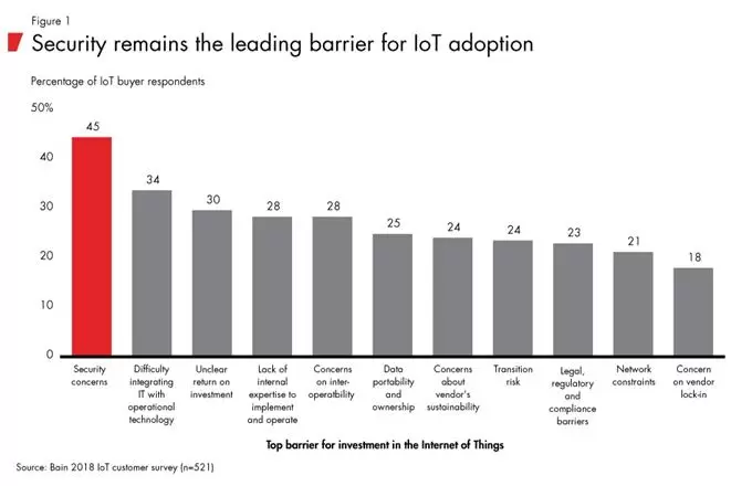 网络安全仍是阻碍物联网继续飞速发展的主要原因,对安全性的担忧降低了使用物联网设备的可能(见下图)。