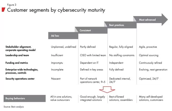 在确定防范这些类型攻击的解决方案时,物联网设备供应商可以根据网络安全能力成熟度对其目标客户进行细分。这种细分有助于根据典型需求确定不同的方法,并反映出企业客户的能力不是静态的而是向更高级别发展的现状(见下图3)。研究发现,处于最不发达端的客户更有可能寻求简化和集成的安全解决方案,而那些具有更高级功能的客户更愿意投资于最佳或定制的单点解决方案。