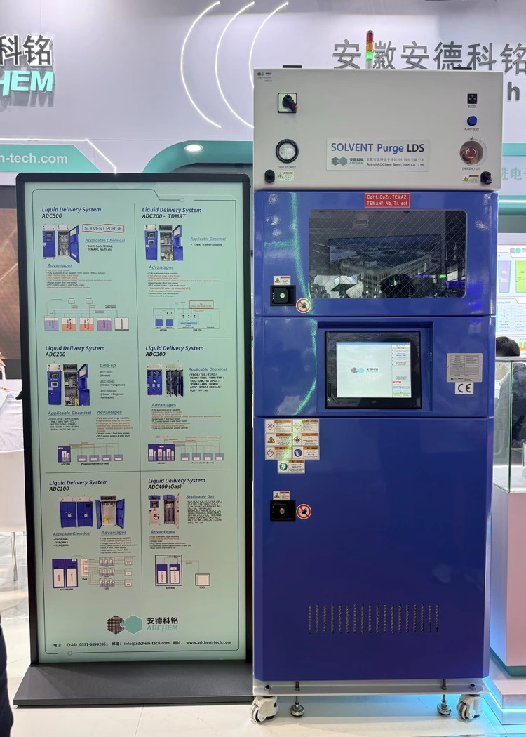 在本次SEMICON China上,安德科铭发布了自主研发的新款LDS设备——具备溶剂清洗功能的ADC500机型。整机分为上下两部分:上部为控制器,内置 PLC 控制模块及电控组件;下部柜体为机械结构,内部布有密集管路、气动阀门及压力表等元件。柜体下方设有五个钢瓶,分别为前驱体源瓶、缓冲瓶A、缓冲瓶B、溶剂源瓶和溶剂回收瓶。此外,设备顶部与底部还装有安全侦测部件,可在化学品泄漏、火灾等异常情况下及时报警并启动连锁保护装置。
