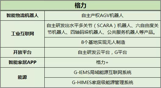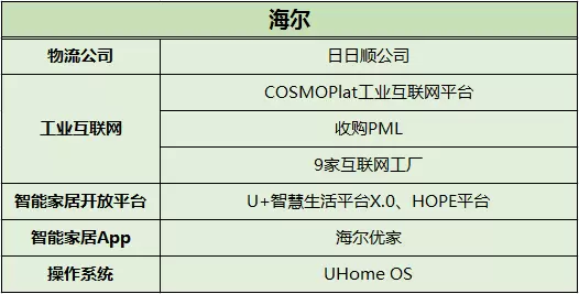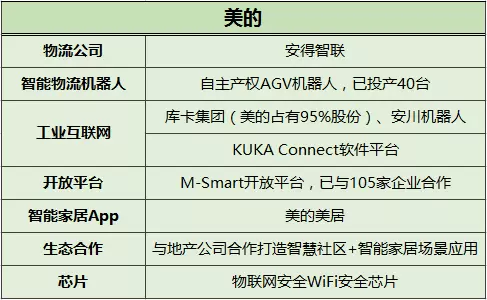海尔在工业互联网、生产自动化方面有卓越的目光,多年前便开始利用COSMOPlat工业互联网平台,建设9个自动化生产基地,升级自身产能。格力主要将精力放在自主研发机器人上,2017年发布了四类工业机器人。美的则一举收购了库卡集团补足了在智能制造方面的短板,迅速推出工业机器人和机器人连接平台。在这三家公司中,格力是唯一一家关注能源管理的企业,美的是唯一一家能够自主制造WiFi安全芯片的企业。