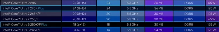 例如与前代同级别的酷睿Ultra 7 265K/KF以及酷睿Ultra 5 245K/KF相比,英特尔酷睿Ultra 7 270K Plus和酷睿Ultra 5 250K/KF Plus在核心数量方面都进行了相应提升。酷睿Ultra 7 270K Plus与前代酷睿Ultra 9 285K看齐,达到了24核(8P+16E)24线程,酷睿Ultra 5 250K Plus则提升到了18 核(6P+12E)18线程。