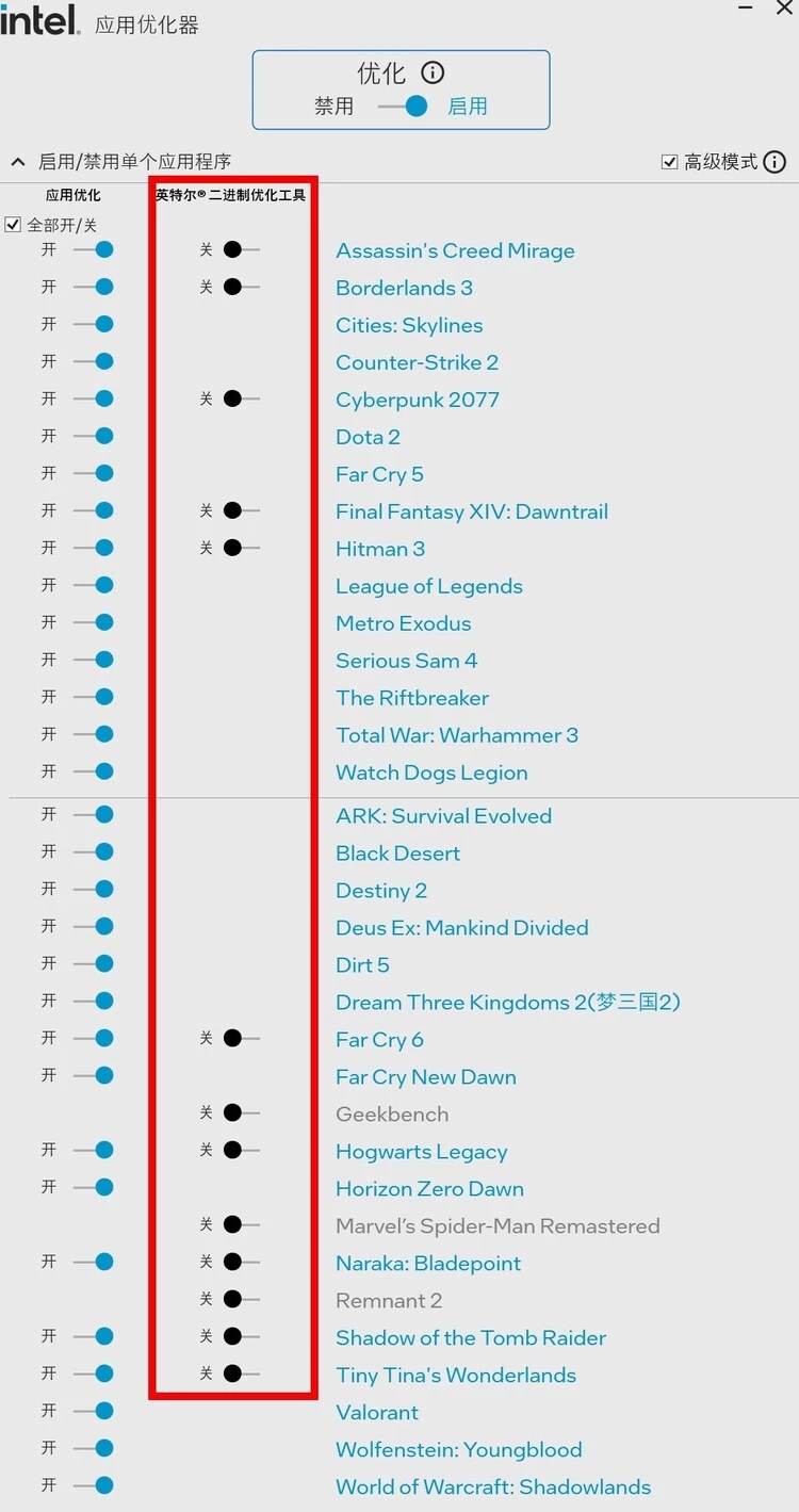 我们只需要在主板BIOS中开启DTT(老BIOS)或Intel innovation platformframework(新BIOS),再安装Intel ApplicationOptimization,也就是英特尔应用优化器软件,即可在界面上看到目前支持的二进制优化游戏列表。后续英特尔还会快速推进更多游戏对二进制优化的支持。