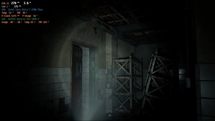 《生化危机9》我们分别测试了室外场景和室内场景的平均帧,依然是最低画质、1080p分辨率,酷睿Ultra 7 270K Plus和酷睿Ultra 5 250K Plus室外、室内平均帧率分别为258/278fps以及235/254fps,相对前代同级处理器依旧有着碾压级别的大幅升级。