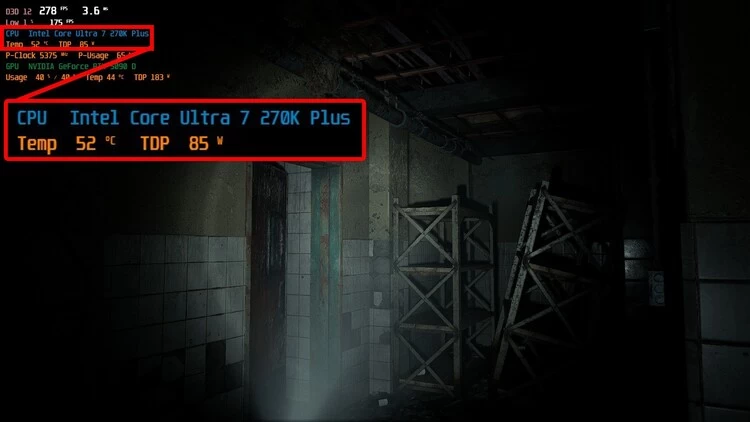 另外从一些游戏实机截图中也能看到,酷睿Ultra 200S Plus平台游戏帧率暴增的同时,其实际功耗和发热并未相应增高,整体能效表现同样进步明显。