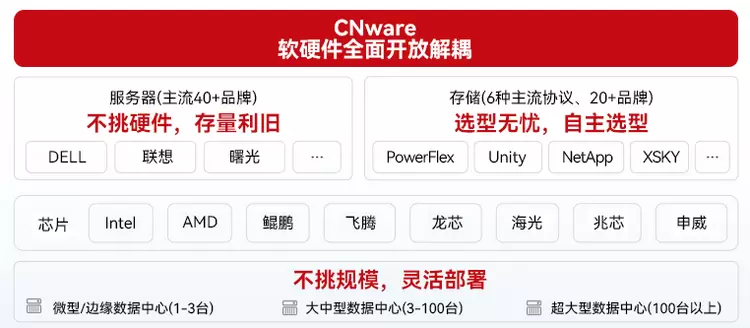 CNware“软硬件解耦 + 一云多芯” 的架构,支持鲲鹏、海光、飞腾、兆芯、龙芯、申威等国产六大芯片架构,既能纳管现有服务器,也能利旧老旧设备。