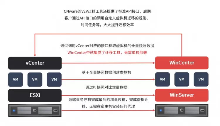 迁移过程中的业务中断,是企业替换 VMware 时的重要隐性成本。CNware 通过“双轨并行 + 热迁移技术”:迁移前,通过统一API接口纳管VMware与 CNware平台,新旧环境并行运行;迁移中,支持V2V、P2V热迁移。通过 “全量复制 + 增量同步 +验证切换”的三步法,企业能有效保障业务的无感知切换,将全程停机时间可压缩至分钟级。这套成熟的VMware迁移流程,已在多个行业客户中得到验证。