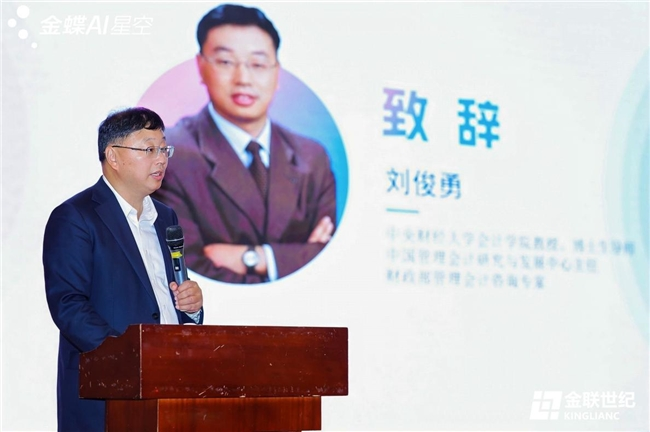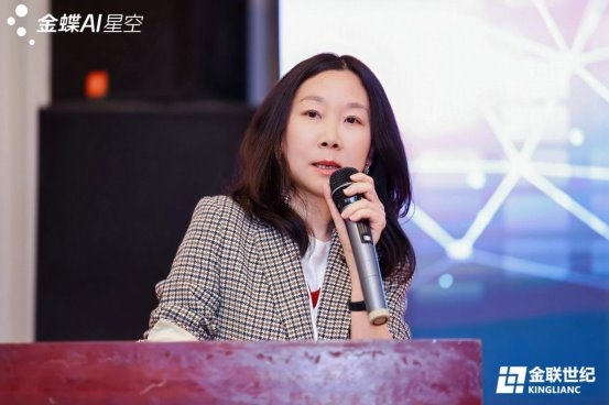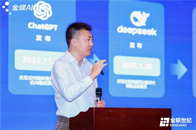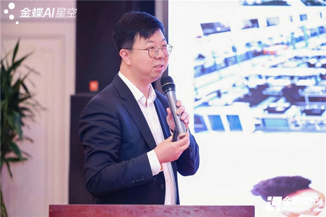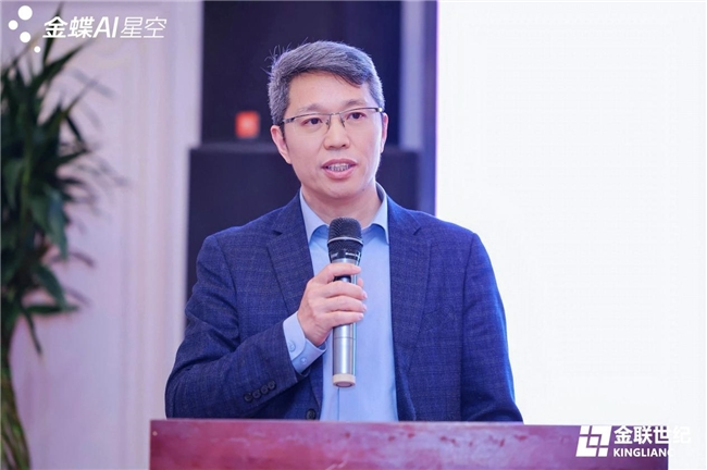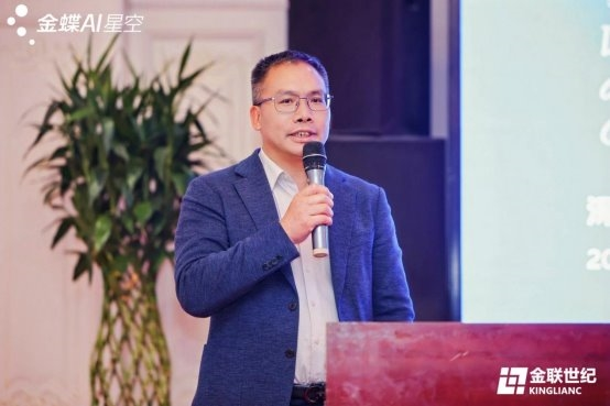 随后,北京金联世纪科技有限公司总经理毛英善先生发表致辞,深刻阐述了AI范式的根本性变革。他指出,AI正从辅助人类的“顾问”进化为能够直接理解业务、执行任务的“数字员工”,推动生产力从“对话式交互”迈向“端到端自动化”的“零阻力”进化。毛总强调,AI的赋能效果取决于“高质量的数据土壤、深厚的业务本体、完善的Skill生态”三大基石。他提出,AI不是SaaS的终结者,而是其最强大的进化加速器,金蝶早已提出AI EBC(企业业务能力)理念,推动企业从记录流程的“ERP”时代迈向智能驱动决策的“AI EBC”时代,实现从“记录系统”到“智能系统”的质变。
