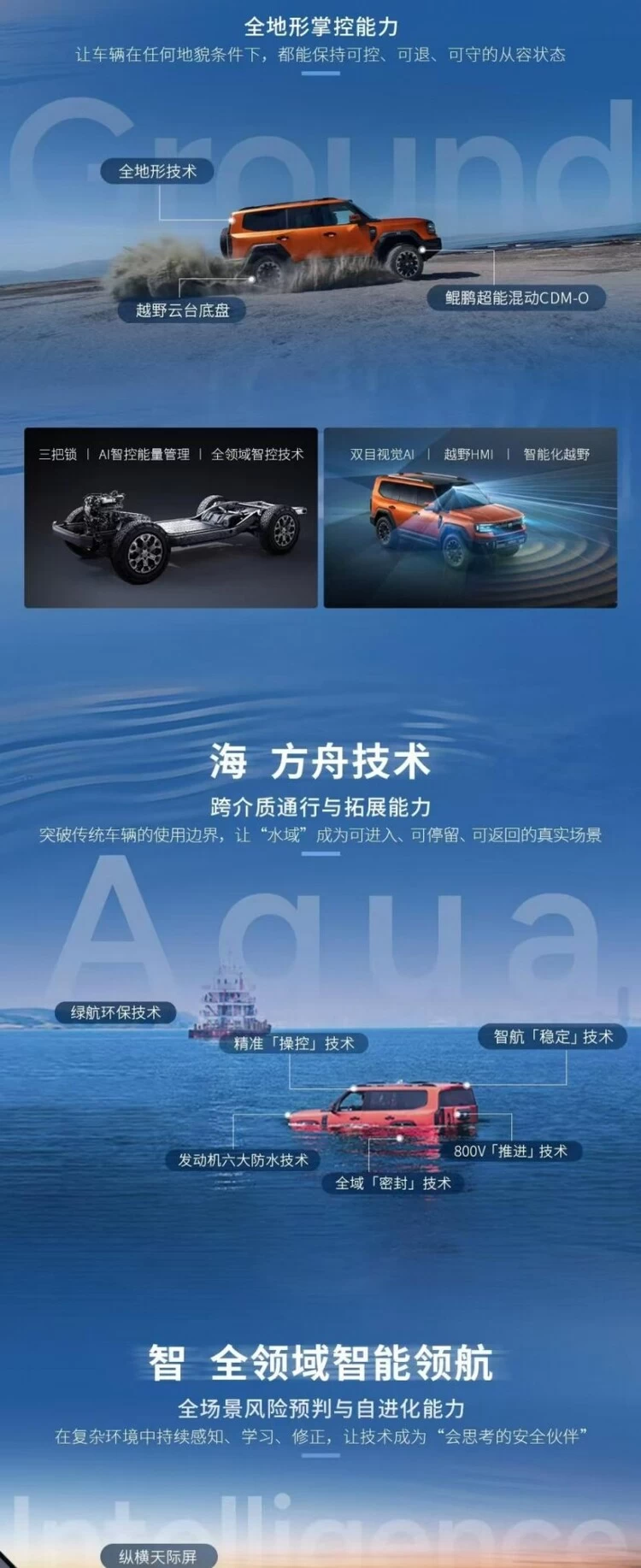海域能力维度,更是纵横GAIA全领域智控系统的核心突破。通过专属两栖技术、全域防水防护等创新设计,打破传统越野的场景边界,将水域从越野探索的“禁区”变为可深度探索的全新场景,实现了越野领域的跨介质通行突破。