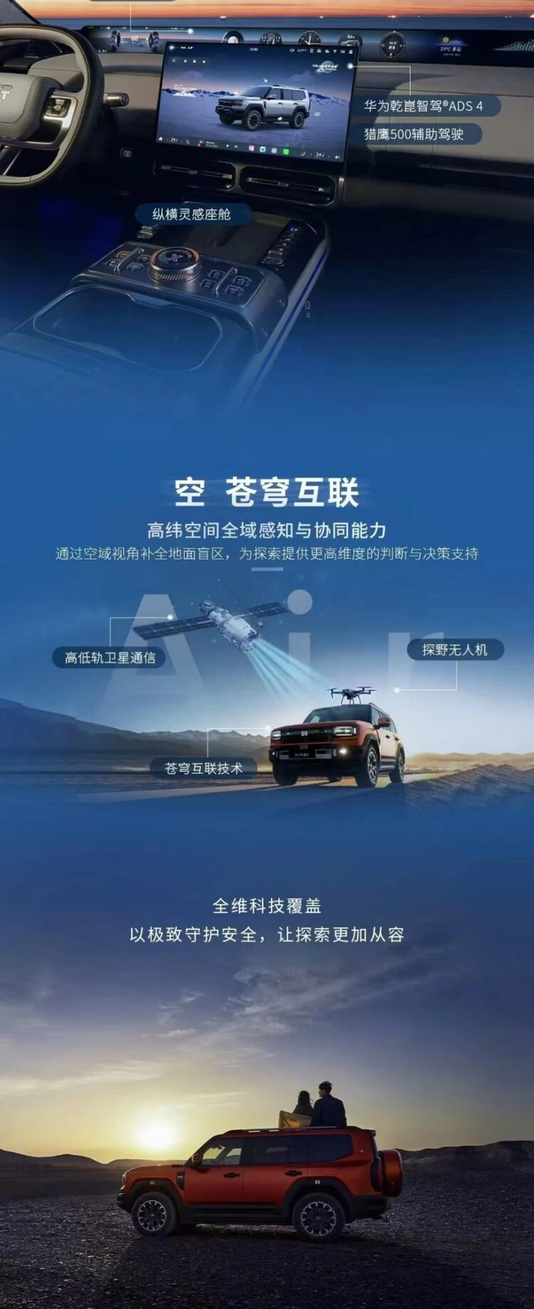 纵横GAIA全领域智控系统空域高纬感知能力的布局,则为越野探索补上了关键的高维视角,通过卫星通信、无人机协同等技术构建起全域感知体系,为车辆的全领域探索提供更高维度的决策支撑,让越野探索的安全性与边界感实现双重升级。