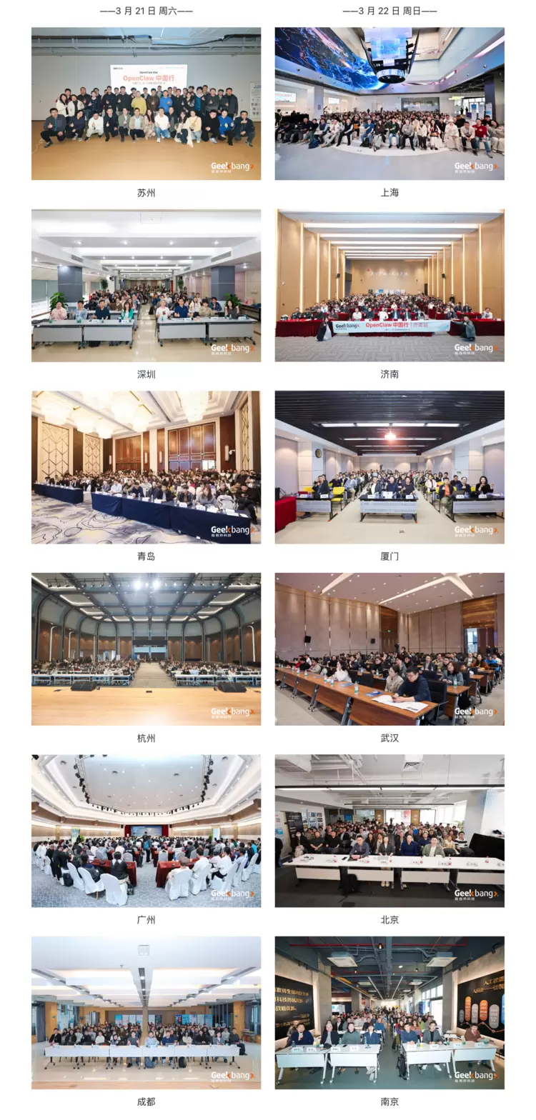 作为一场面向 AI 开发者的全国巡回交流活动,「OpenClaw 中国行」足迹遍布北京、杭州、苏州、深圳、青岛、成都、广州、上海、南京、厦门、济南、武汉 12 座城市,60 位行业讲师倾情助力,为各地开发者带来干货满满的实操分享。