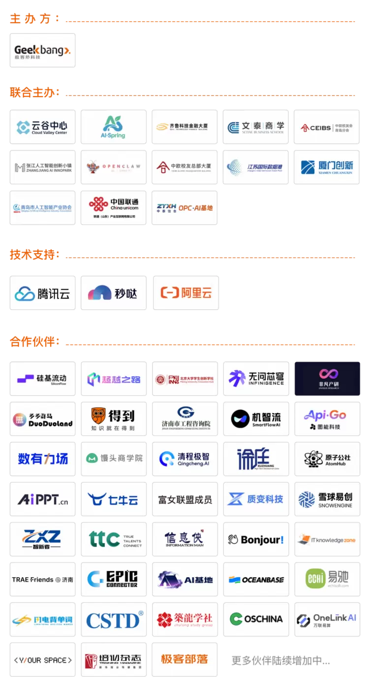 作为主办方,极客邦科技深耕 AI 生态十余载,构建了完善的技术服务体系,旗下 AI 创业者同侪学习平台——TGO 鲲鹏会、AI 应用发布和发现平台——模力工场、AI 学习平台支持——极客时间,AI 开发者前沿资讯社区—— InfoQ,全方位联动,为活动提供内容策划、讲师邀请、宣传推广、学习资源等全流程支持,其中 TGO 鲲鹏会各城市负责人全程参与致辞、统筹,成为活动落地的重要支撑。