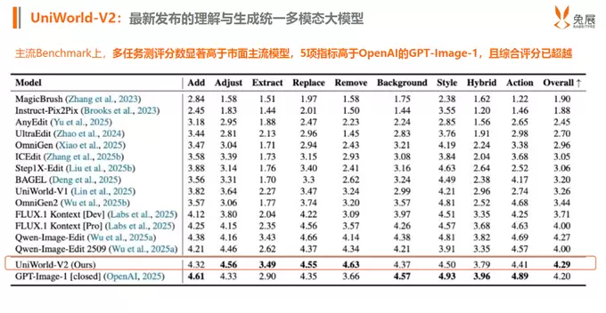 2025年6月初推出的 UniWorld-V1 是国内首个开源视觉理解与生成统一多模态大模型,早于 Nano Banana 3个月发布。随后2025年11月推出的 UniWorld-V2 作为首个国产开源原生多模态统一大模型,填补了国产算力的空白,在 GEdit-Bench 测试中综合性能超越 OpenAI 旗下 GPT-Image-1 等顶尖闭源模型,多项关键指标亦一度优于谷歌的Nano Banana系列模型。这一系列技术突破,使 UniWorld-V2 荣获广东省卓越人工智能与机器人奖(XAIR奖)人工智能一等奖,并入选2025年西丽湖论坛深圳市七大科技关键成果之一。