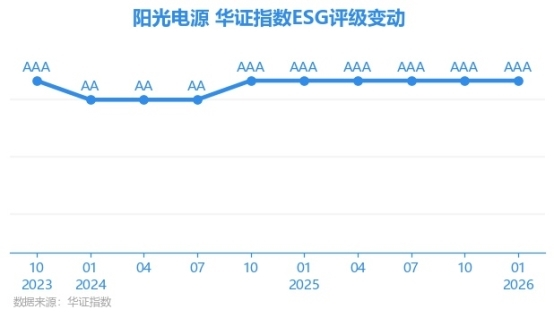 近日,华证指数发布了截至2026年1月31日的最新一期ESG评级结果。阳光电源在此次评级中斩获AAA级,这也是华证指数评级体系中的最高等级(该体系共设九档,最低为C,最高为AAA,AA级次之)。相较于2025年10月31日公布的上一期结果,阳光电源的评级依然维持在AAA级。