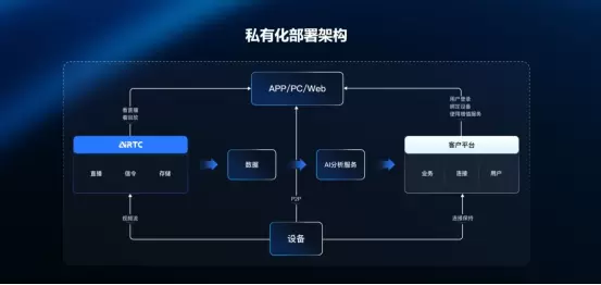 AIRTC云平台在支持公有云的基础上,也支持私有云部署。这意味着厂商可以将服务部署在自己的云上,数据自主掌控,核心业务系统保持在自有体系内,降低对外部平台的依赖。这种方式不仅在技术上更灵活,也让后续的商业决策拥有更大的空间。