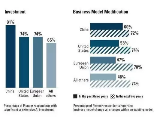 与世界其他地区相比,中国先锋队在人工智能相关技术、数据、流程和人才方面的投资水平全面提高。不出所料,中国先锋企业也是最有可能在过去一年改变商业模式、利用人工智能优势的企业。