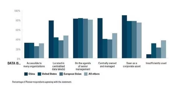 中国先锋队在这方面做得特别好。例如,78%的公司数据保存在集中的数据池中,而欧洲和美国的先锋公司分别只有37%和43%。83%的中国先锋者集中管理公司数据,而欧洲和美国先锋者的这一比例分别仅为39%和40%。