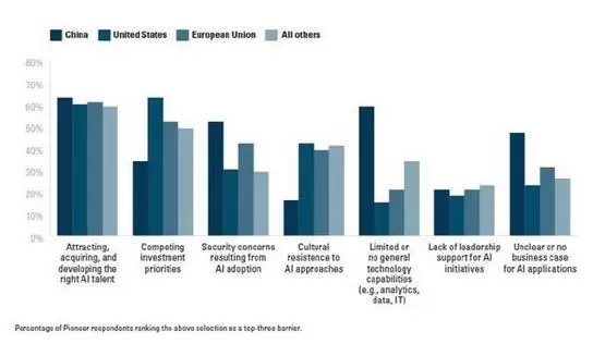 中国先锋者在可用技能方面正面临瓶颈。中国近六成的先锋企业表示,技术人才和能力方面的限制阻碍了它们的发展,超过了美国或欧洲有同感的公司数量。这种反差可能与中国企业为其人工智能项目提供充足的资金、更好的管理支持和较好的文化接受程度有关。
