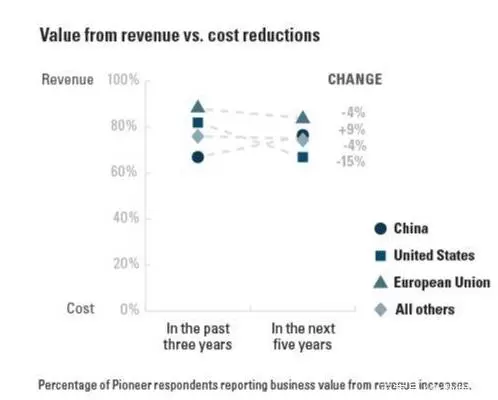 虽然80%的美国和欧洲先锋者认为收入增长是当前人工智能的主要价值,尤其是在建立一个有竞争力的领先地位方面,但只有65%的中国先锋者持相同看法。总体来说,先锋公司预计,对收入增长的重视将在5年内趋同,但届时可能已经为市场份额奠定了重要基础。