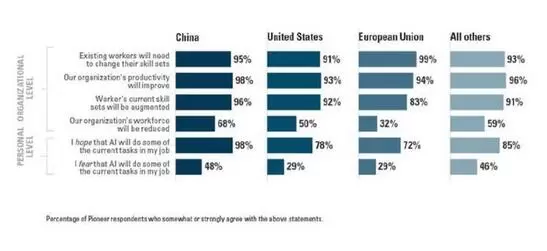 与此同时,98%的中国先锋队受访者希望人工智能接管他们目前的部分工作任务,此项分别比欧洲和美国高出26%和20%。与更强的内部关注点一致,中国受访者也更乐观地认为,人工智能将增强工作技能,提升整体生产力。