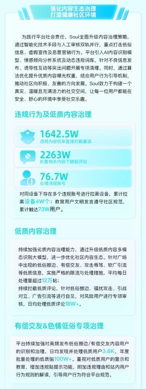 在内容治理层面,Soul于2025年全面升级审核与处置机制,重点针对低俗内容、虚假宣传及恶意营销展开整治。全年通过机器预审直接拦截违规内容1642.5万条,处置违规账号76.7万个。针对广场中出现的擦边内容、有偿交友及恶意引战行为,平台实施限流与快速处理,日均处置量超过12万帖,对同设备下存在多个违规账号的团伙型账号,累计拉黑设备4万个,持续净化社区环境。