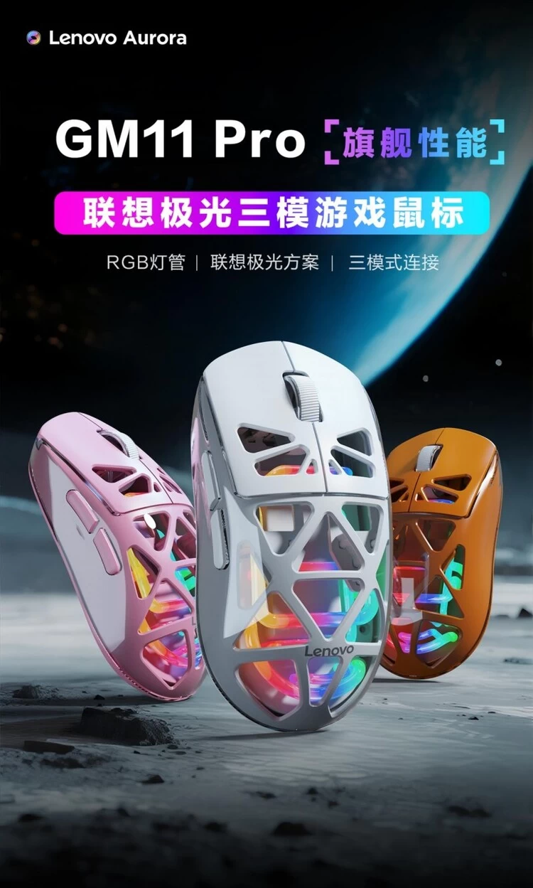 在视觉表现上,GK10Pro采用水波纹键帽,通透有质感,不仅支持1600万色RGB灯效,更内置多种动态灯光模式,结合透光结构设计,使灯效呈现更加通透立体,在电竞环境中营造更强沉浸氛围。GM11 Pro鼠标则以镂空设计打造独特外观,在减轻重量的同时兼顾了视觉层次感。依托Lenovo Aurora极光软件,键盘与鼠标还可实现灯效同步,多设备联动让桌面视觉节奏保持一致,进一步强化整体电竞体验。
