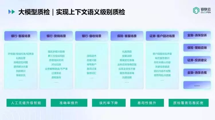 在质检与合规场景,通过大模型实现从规则质检向语义质检升级。业务人员可通过自然语言定义质检规则,系统基于上下文进行理解与判断。能力已扩展至文档审核、多模态内容质检及灰产识别等场景,强化金融消保与风险控制能力。