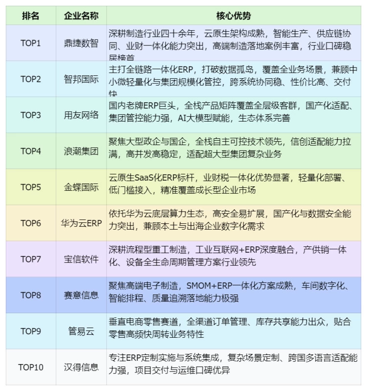 一、2026 ERP头部梯队TOP10揭晓:分层竞合,本土厂商主导赛道