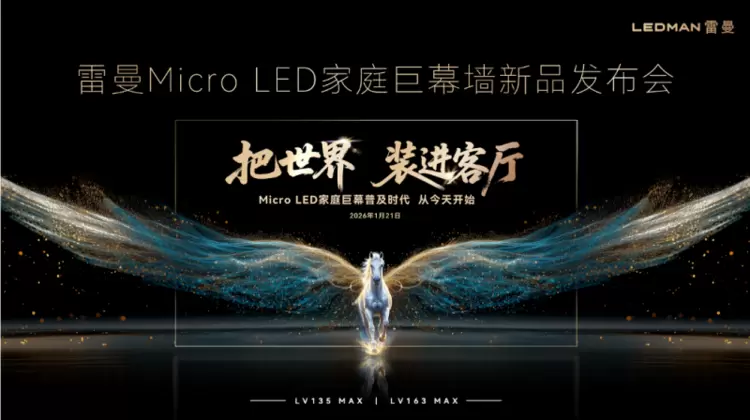 雷曼率先打破Micro LED局限于商用场景的桎梏,2021年9月,雷曼光电率先打破行业桎梏,将Micro LED技术从商用拓展至C端家用场景,正式开启Micro LED民用化新征程,为中国LED显示产业开辟全新增长曲线。此后产品不断迭代升级:2022年7月全球首发163英寸8K Micro LED家庭巨幕,以超大尺寸、超高清画质重塑家用高端显示边界;2026年1月推出第三代产品,融合COB封装与PSE节能冷屏技术,推动 Micro LED从“小众顶奢”走向“高端普及”,打开万亿级家用显示新蓝海。