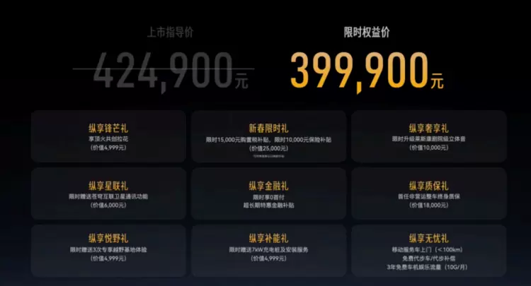 发布会现场公布了纵横G700顶火鸣镝版,上市指导价42.49万元,限时权益价39.99万元,同步推出九重上市专属购车权益。涵盖限时订车礼、金融方案、置换补贴及专属质保政策等多重福利,让每一份对旷野的热爱,都能拥有极致可靠的硬核支撑。