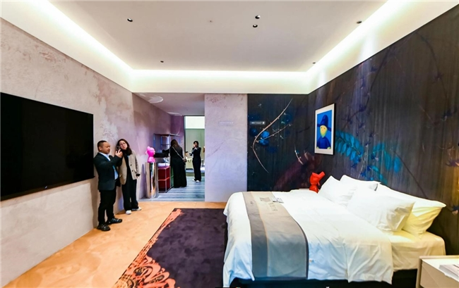 【非凡酒店】大师IP联合策展空间总面积超500㎡,以“场景化、体验感、实用性”为核心。覃思团队携手多位艺术家打造六大特色场景——三大主题客房与三大配套功能场景,将建材、设计、IP(艺术、潮玩)、运营与数字家理念深度融合,让每一处空间都承载着“艺铸非凡、智启新篇”的核心理念。智谋纪AI照明作为灯具品类独家战略合作品牌,全场景入驻,将AI光影的魅力发挥到极致,每一处光效都精准贴合场景定位、诠释设计内涵。