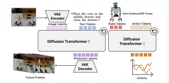 简单讲:一个负责"理解世界会怎么变",一个负责"决定手该怎么动"。视频生成模型花了海量算力学到的物理直觉,被直接注入了机器人的决策系统。