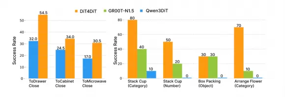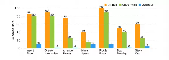 零样本泛化是该方法最突出的能力。换物体材质、换形状、换数量:面对从未见过的测试场景,DiT4DiT 仍保持 40%–70% 的成功率。对比看, Qwen3DiT 在多项泛化测试中直接归零。这一差距说明:视频生成赋予的物理直觉,确实比静态图文对齐更贴近真实世界的复杂性。