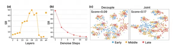 研发团队在消融实验中发现了一个违反常理的结论:从视频模型提取特征时,只需单步去噪效果最好,步数越多、太清晰,性能反而下降。提取层也有讲究,第 18 层(中间偏深层)的特征最优,达到性能峰值。
