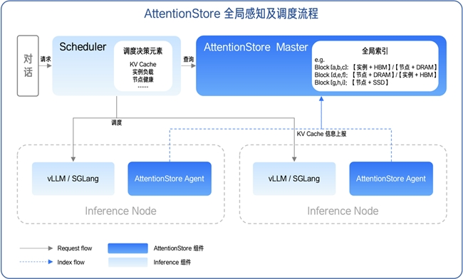 首先,调度系统要如何匹配到最优节点,避免昂贵的重复计算开销:传统调度系统无法感知缓存的全景分布与介质状态,存在严重的调度盲区。这导致请求往往被分发至无缓存节点,触发大规模重复计算与存储冗余,难以发挥分布式缓存的集群效应。