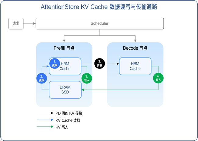 Prefill 节点生成的 KV 传输至 Decode 节点,并异步回写至主机内存 / SSD;