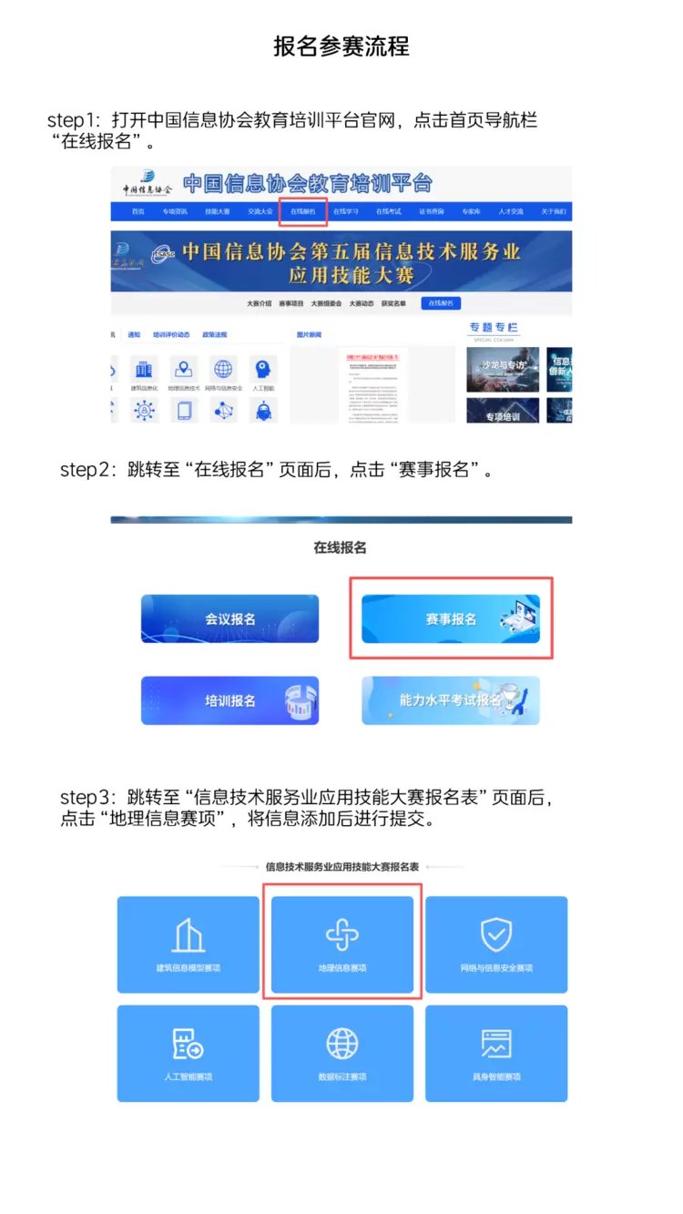 参赛选手以团队或个人的形式报名参赛。选手可以通过“中国信息协会教育培训平台”官网直接报名参加大赛。