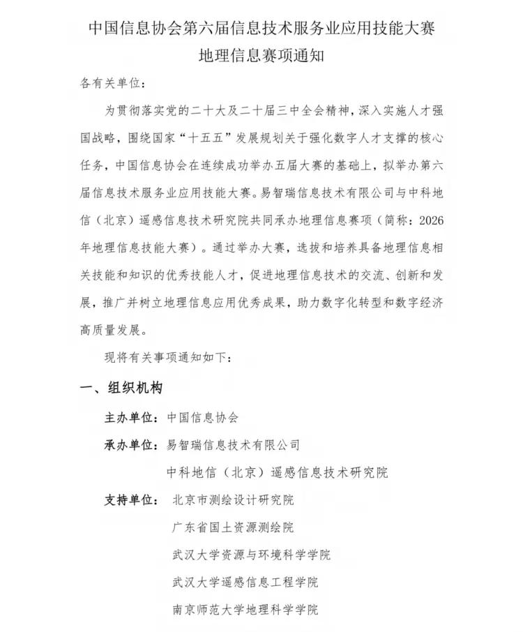 “2026年地理信息技能大赛”是由中国信息协会主办的“第六届信息技术服务业应用技能大赛”的地理信息赛项(简称:2026年地理信息技能大赛)。由易智瑞信息技术有限公司与中科地信(北京)遥感信息技术研究院共同承办。通过举办大赛,选拔和培养具备地理信息基础理论知识、熟练掌握主流地理信息软件操作、能够独立完成地理信息数据处理和分析的优秀技能人才,促进地理信息技术的交流、创新和发展,推广地理信息应用优秀成果,助力数字化转型和数字经济高质量发展。