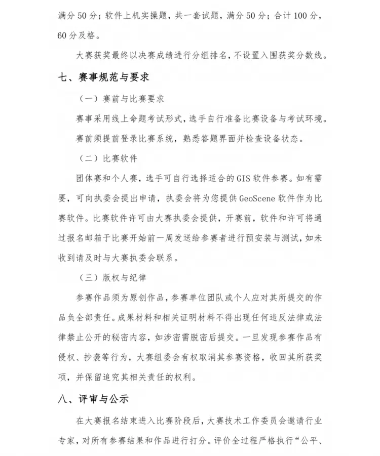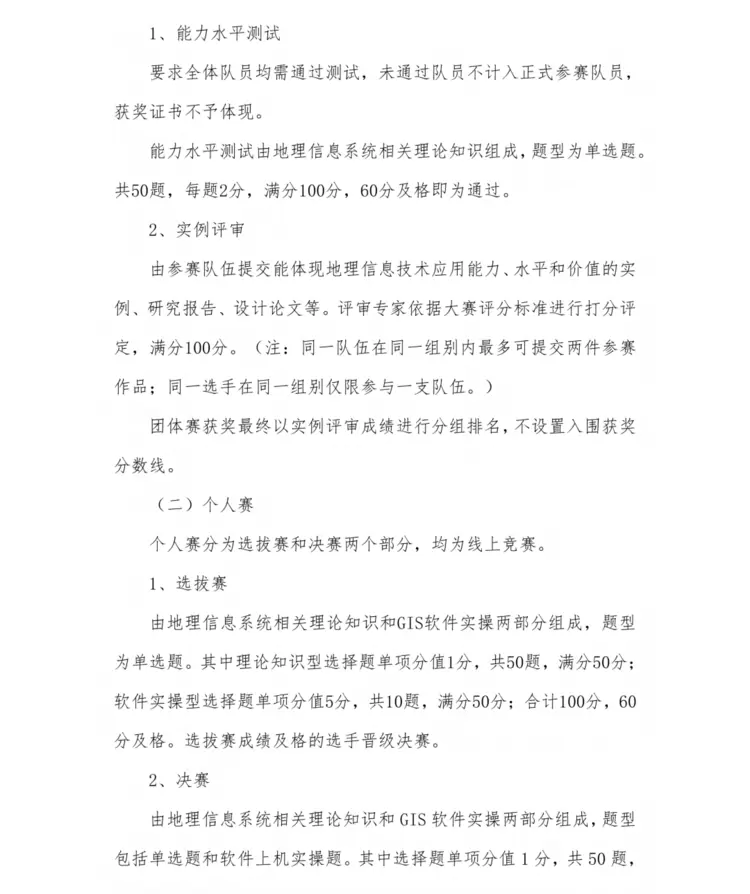 由地理信息系统相关理论知识和GIS软件实操两部分组成,题型为单选题。其中理论知识型选择题单项分值1分,共50题,满分50分;软件实操型选择题单项分值5分,共10题,满分50分;合计100分,60分及格。选拔赛成绩及格的选手晋级决赛。