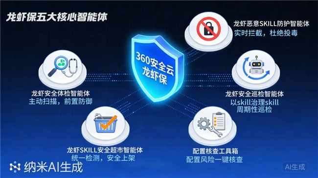 龙虾安全体检、龙虾SKILL安全超市、龙虾安全巡检、龙虾恶意SKILL防护、配置核查工具箱五大智能体各司其职却又高效协同,AI help AI,7×24小时为龙虾行为兜底。