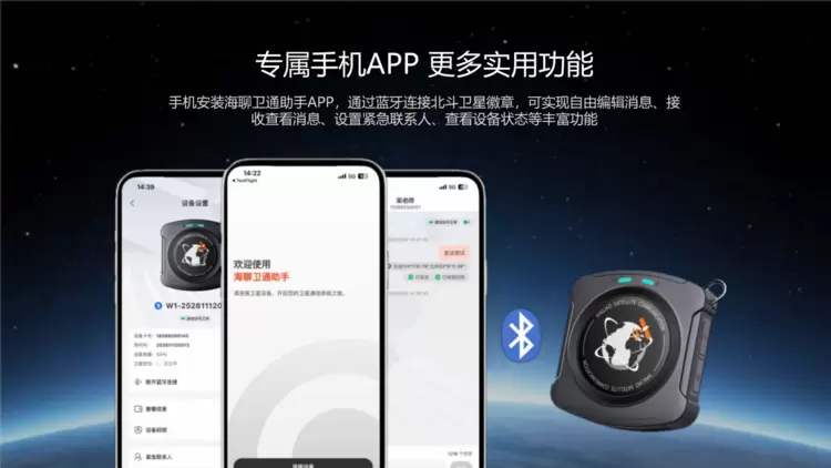 用户只需在普通手机上安装“海聊卫通助手APP”,通过蓝牙连接该徽章,苹果、安卓等各类机型均可获得北斗三号卫星双向通信能力,支持编辑北斗短信、设置紧急联系人、查看设备状态等,操作便捷且无需专业知识。