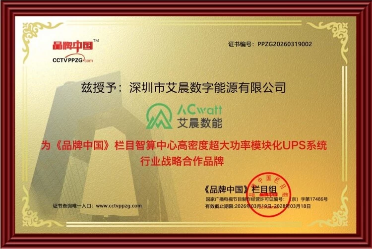 市场认可度的持续提升,进一步佐证了艾晨数能在高密度超大功率模块化UPS领域的产品与技术实力。在智算中心高密度超大功率模块化UPS细分领域,艾晨数能凭借三大国内首创的技术创新、过硬的产品品质,实现市场占有率逐年快速提升。据权威市场数据显示,2024年公司主导产品全国市场占有率已超过10%,2025年进一步跃升至15%以上,稳居行业前列。2026年,公司获得“《品牌中国》栏目战略合作品牌”授牌,品牌知名度与行业影响力迈上新台阶。依托深圳总部强劲的制造能力,艾晨数能正加速构建覆盖全球的服务网络,将智能运维、预测性维护等先进服务体系推广至全球。