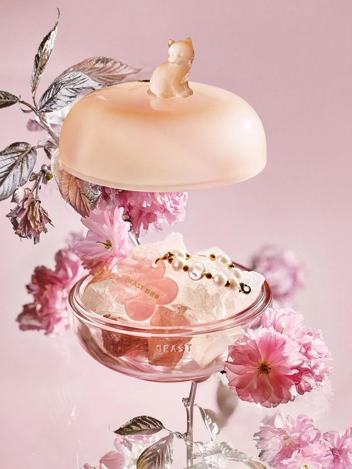 樱花清酒晶石香盒粉澳宝、白水晶、花朵草莓晶散落其间,莹亮剔透,各有寓意。轻轻掀开,前调清甜率先漫出,中调玫瑰与白花次第盛放,整个春天,就藏在这方寸之间。