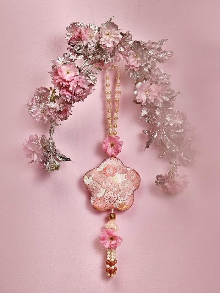 樱花清酒提花香囊锦面粉白相间,天然白色珍珠贝手工逐颗串制,透亮轻盈,自然光下色泽柔和内敛。缀有一只可爱小兔,随身携带,所经之处,皆是樱花香气。