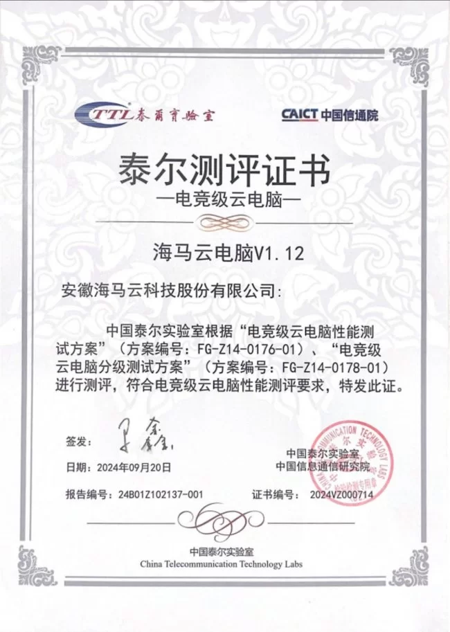 国家级机构认证:海马云电脑已获得中国信通院泰尔实验室颁发的《电竞级云电脑卓越级》认证,其各项性能指标均处于行业第一。