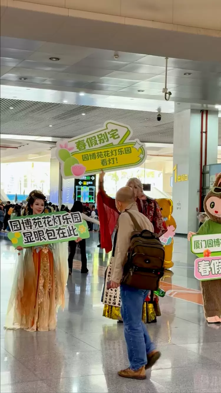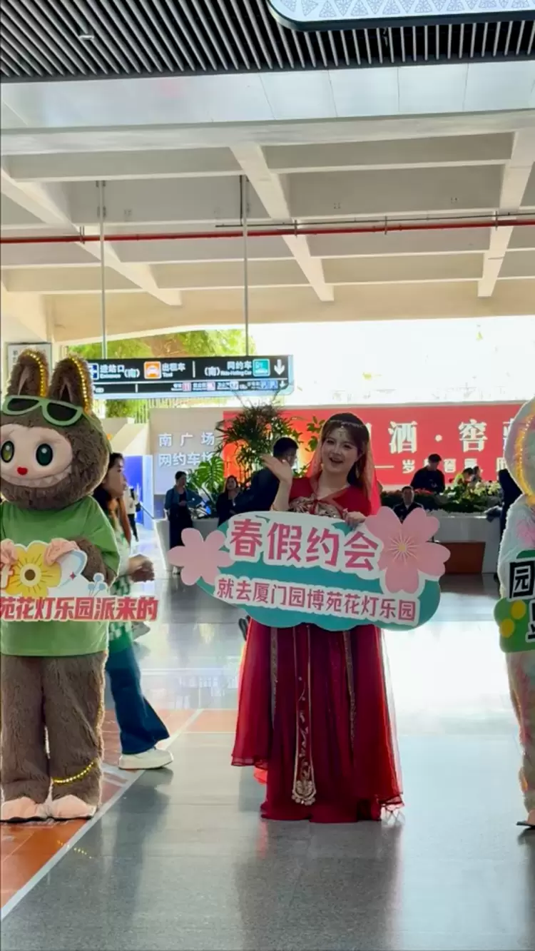 活动现场,花灯乐园NPC天团集体亮相,萌趣十足的玩偶形象与古风装扮演员同框登场,瞬间吸引不少旅客驻足围观、拍照互动。醒目的“春假带娃,来园博苑花灯乐园”“春天!到门文旅防你回厦挖花灯乐园”“共赴欢乐之约”等手牌标语,以及轻松活泼的互动方式,让原本节奏匆匆的交通枢纽空间,增添了几分轻松、热闹和温度,也让不少刚抵厦的游客在第一时间感受到厦门春日出游的活力气息。