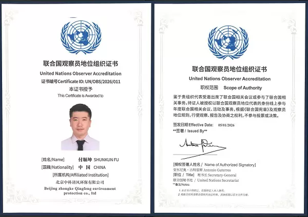 近日,北京中科清风环保有限公司总工程师付顺坤荣获联合国特别观察员称号,获颁联合国秘书长安东尼奥·古特雷斯签署的观察员证书。作为中国环保科技领域首位获此殊荣的烟气治理专家,这一荣誉既是对其个人专业成就的国际认可,也是对中科清风环保践行国家战略、服务生态文明建设的充分肯定,更是中国环保科技力量在全球舞台上的重要亮相。